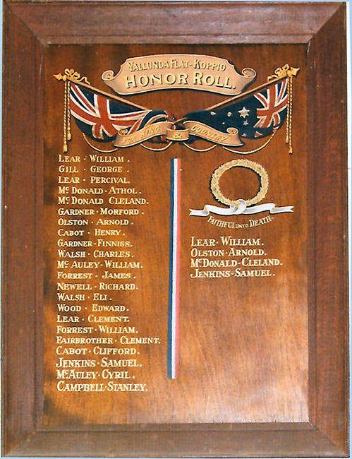 ![]() Yallunda Flat & Kopio District WW1 Honour Roll |